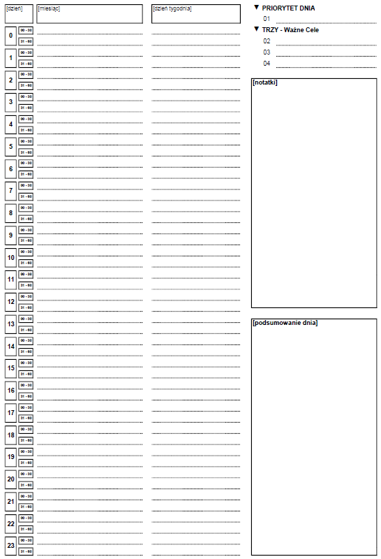 chciałbym podzielić się z Tobą moim planerem dziennym, który wykorzystuję do codziennego planowania. Stworzyłem go w oparciu o doświadczenie, które zdobyłem korzystając z wielu różnych metod i sposobów planowania. Na bazie tych doświadczeń tworząc układ planera moim priorytetem była możliwość zaplanowania całej doby. Korzystam z tego rozwiązania rzadko, jednak czasami się przydaje. Dodatkowo przyjąłem, że maksymalna liczba najważniejszych zadań na jeden dzień to cztery, przy czym jedno z nich jest priorytetem. Dorzuciłem do tego miejsce na notatki i podsumowanie dnia, a układ planowania ująłem w dwóch kolumnach o różnym przeznaczeniu.